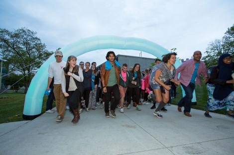 In 2017, Ohio Wesleyan’s senior class president, Lee LeBoeuf (fourth from right), helped launch The Final Lap to bring seniors together to walk campus one last time before graduation. (Photo by Lisa DiGiacomo)