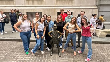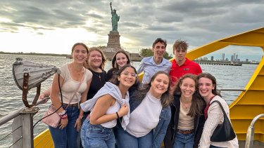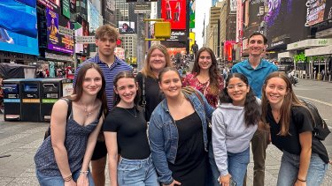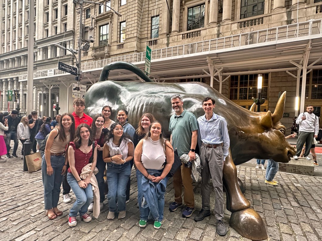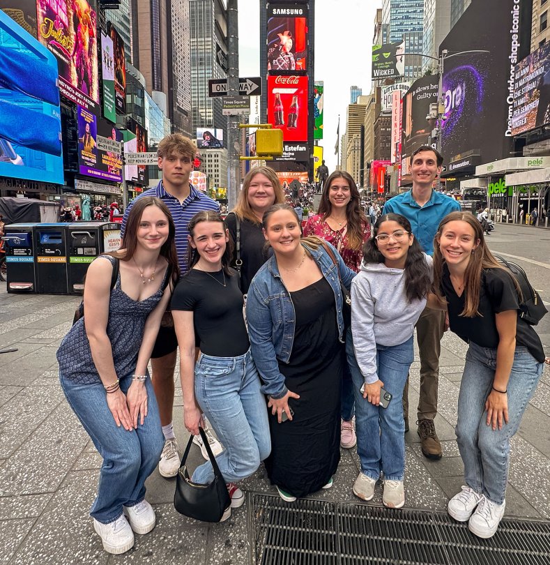 Along with Delahoussaye and Montgomery, Ohio Wesleyan students Araceli Maria Allo '27 of Mariano Roque Alonso, Paraguay; Connor Asbury '27 of Columbus, Ohio; Nia Barjatya '27 of Indore, India; Christian Begg '27 of Powell, Ohio; Elsa Hoam '27 of Fredericktown, Ohio; Frankie Nuss '27 of Columbus, Ohio; and Haley Young '27 of Grove City, Ohio, traveled to New York City from May 6-9, 2025, to learn more about business careers in the city that never sleeps.