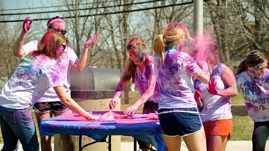 Laughter, music, and colored powders of blue, pink, and yellow filled the air on the lawn of Thomson Hall last Saturday. The Festival of Colors made its successful debut at OWU as students and other members of the community joined in on the color throwing, and white t-shirts, hair, and faces took on rainbow-like hues. A major festival in India called “Holi,” it is celebrated on the last full moon of the winter season, to usher in the spring, explains Krina Patel ’15, a member of SANGAM, the sponsoring campus club consisting of students from various parts of South Asia.