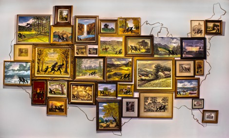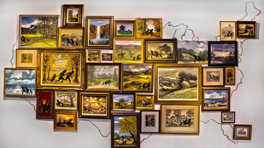 The inspiration of Chicano art, or embracing one’s roots in Mexico, is evident throughout Frésquez’s Gallery 2001 exhibit. The display includes 11 pieces from his series “Salon de los Ilegales,” structured originally in an outline of the United States. For the series, Frésquez purchased thrift-shop landscapes and added shadowy figures appearing to run through the canvases.