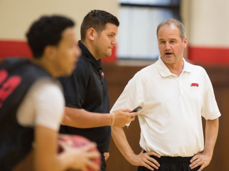 Head Men’s Basketball Coach Mike DeWitt (right) and Assistant Men’s Basketball Coach Nate Conley assess players during a Fall practice.