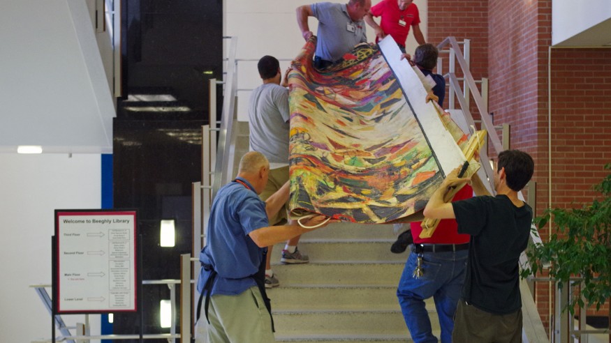 Ohio Wesleyan employees, overseen by Justin Kronewetter (lower left) install a 17-foot-by-6-foot mixed media artwork in Beeghly Library. Created by OWU alumnus and renowned artist Terence LaNoue ’64, the artwork by was donated to the University by a Chicago couple. (Photo by Spenser Hickey ’15)