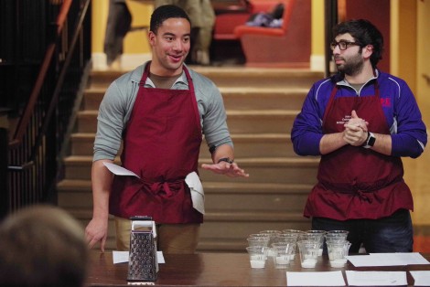 Ohio Wesleyan students Carlos Jackson '17 (left) and Patrick Puracchio '18 help teach a Cooking Matters class. The program works to address community food insecurity issues. (Photo by Spenser Hickey ’15)