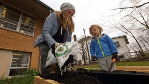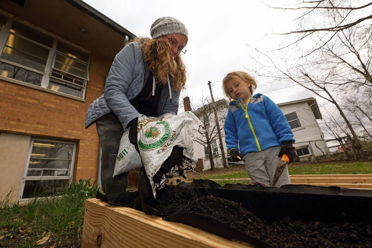 Luca Fritz and his mom, Michelle, were among the group helping to plant the garden. Asked how he got so good at the work, Luca shared that he wasn’t new to the task.