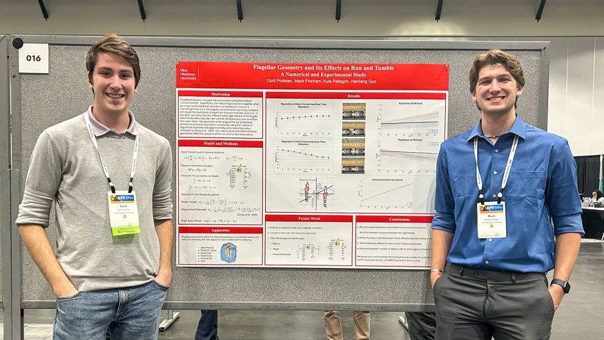 Fincham and Podolan participated in Ohio Wesleyan's 10-week Summer Scholarship and Research Symposium (SSRP) and subsequently presented a poster of their findings, "Flagellar Geometry and Its Effects on Run and Tumble - A Numerical and Experimental Study," at the 78th annual meeting of the American Physical Society Division of Fluid Dynamics (APS DFD), held Nov. 22-25 in Houston, Texas.