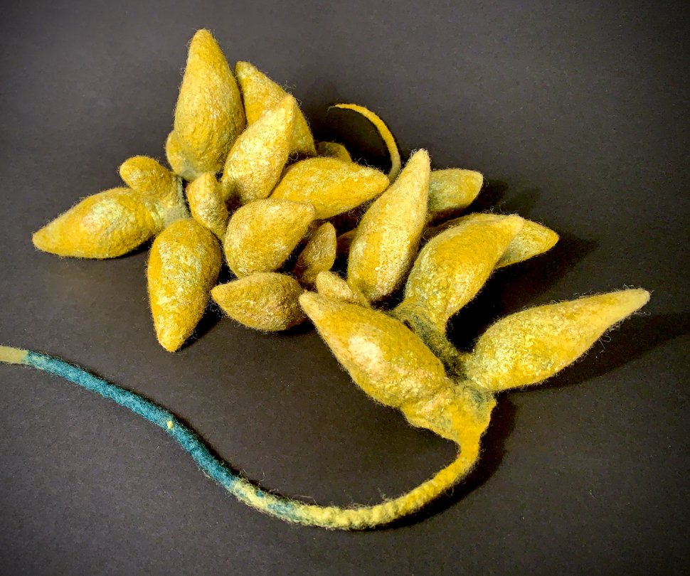 - Cynthia Cetlin, M.F.A., who teaches metals, 3-D design, art education, and art history. “I am presenting metalwork alongside fiber,” said Cetlin, a member of the OWU faculty since 1987. “All of it is adornment. … A single brooch among my work here combines silver and copper fabrication with silk thread and cocoons, and I enjoy the strange contrast of parts. In the past, my work was about memory and narrative. Right now, I am more interested in sculptural form which creates a sense of life and movement.”