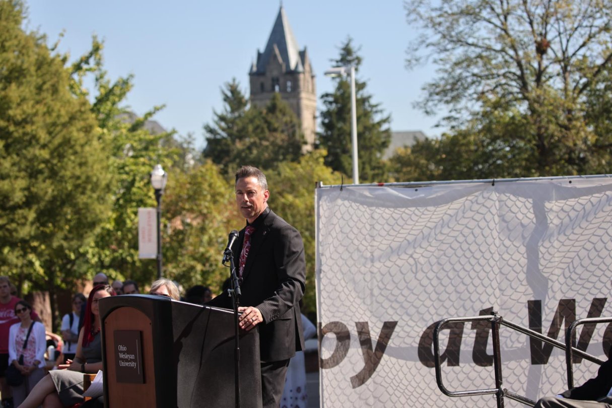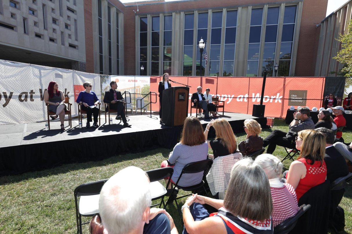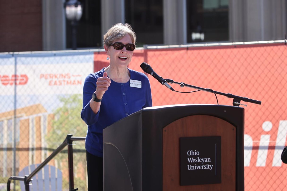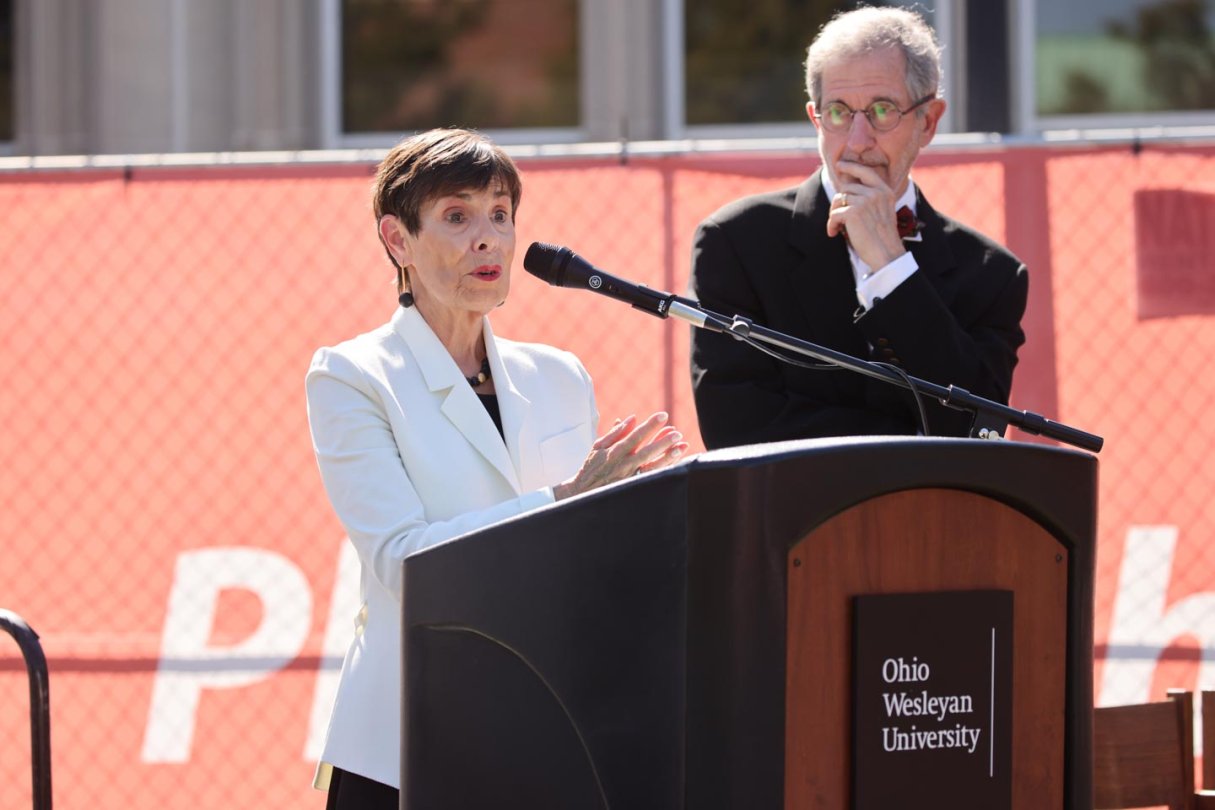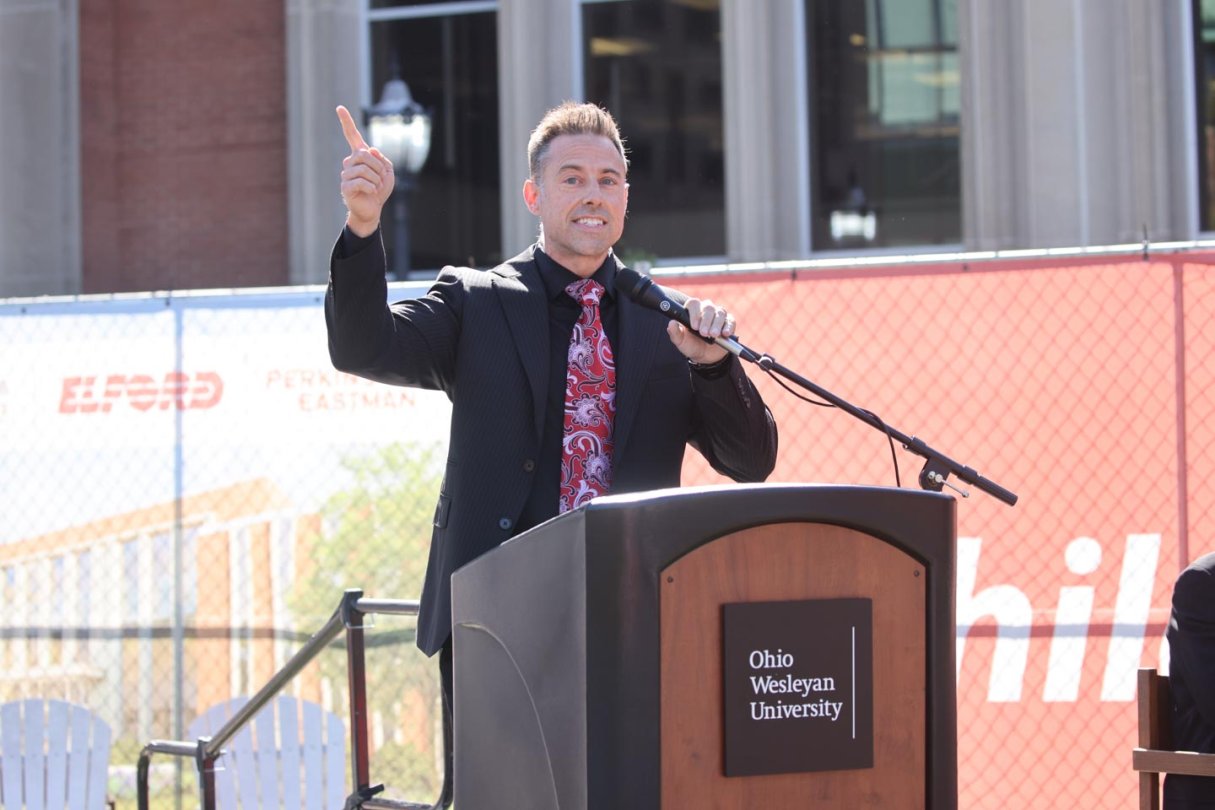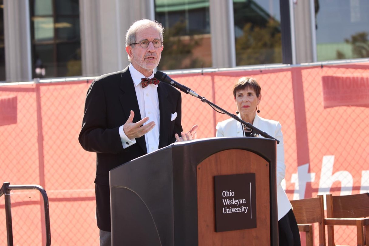 During a campuswide celebration Oct. 3, Ohio Wesleyan President Matt vandenBerg turned a ceremonial shovel of dirt and introduced donors to share news of $15 million in gifts and commitments to create the Smith Center for Faculty Excellence and the Palmer Center for First-Generation Student Success.