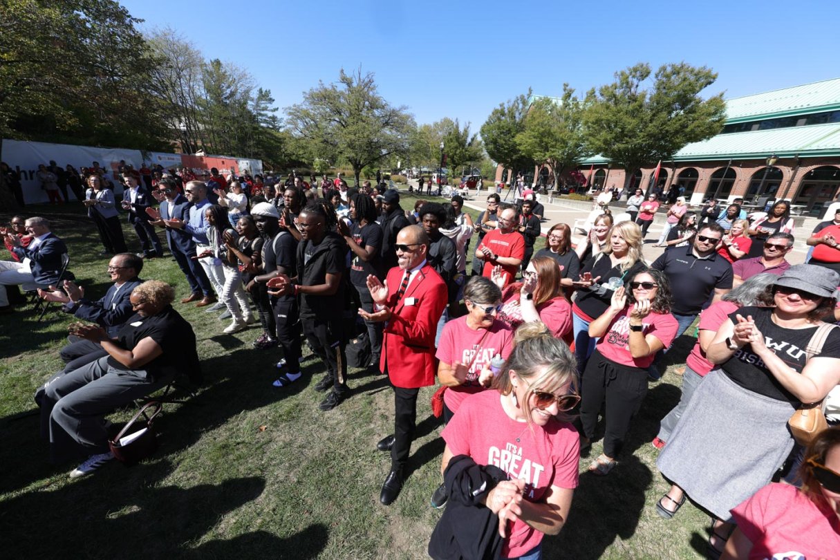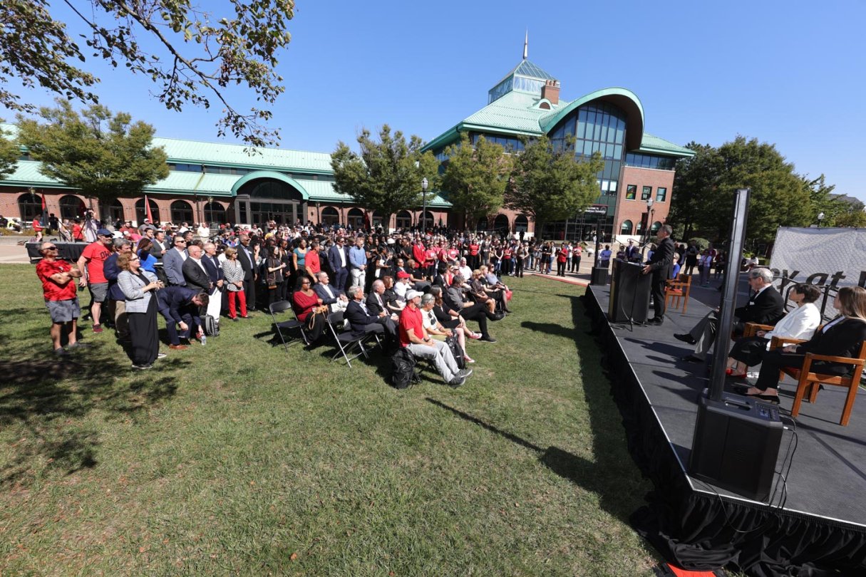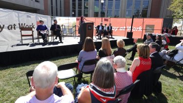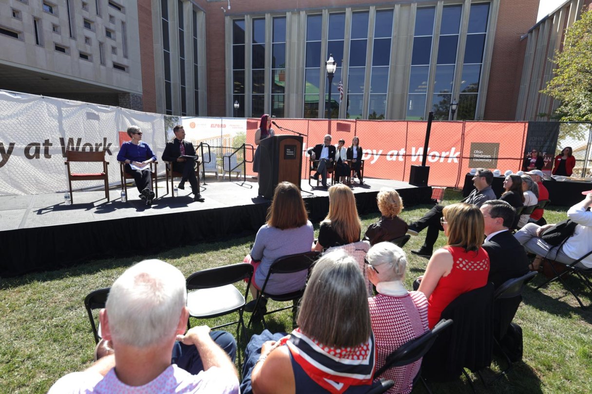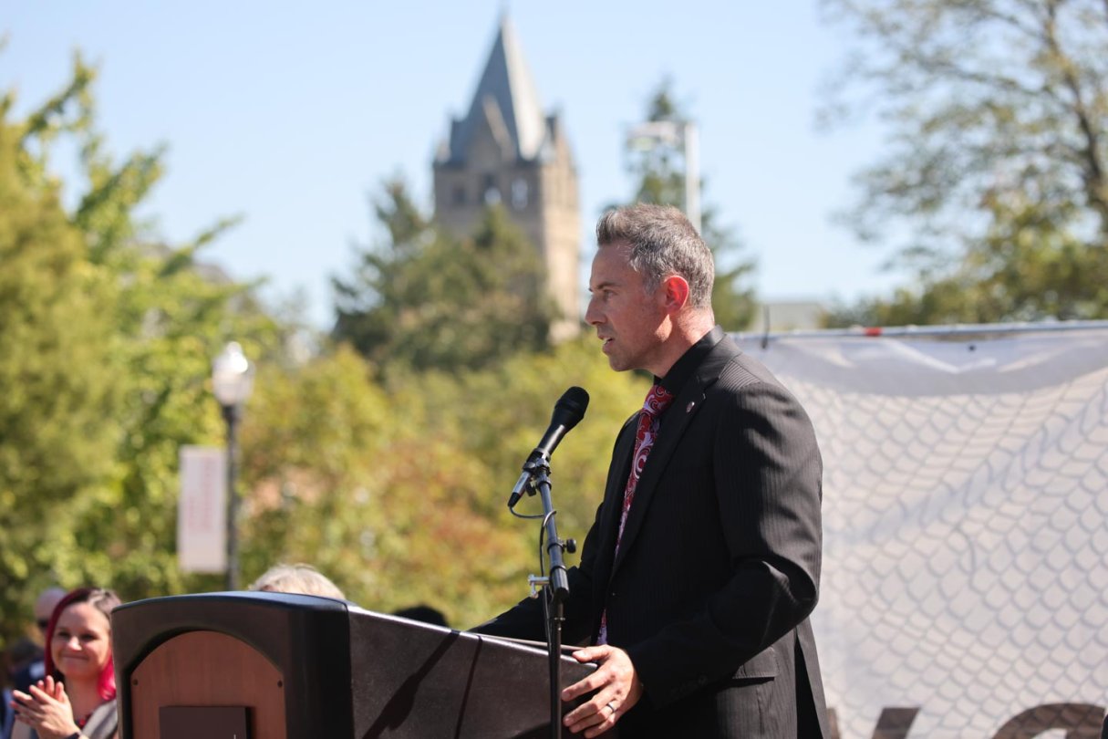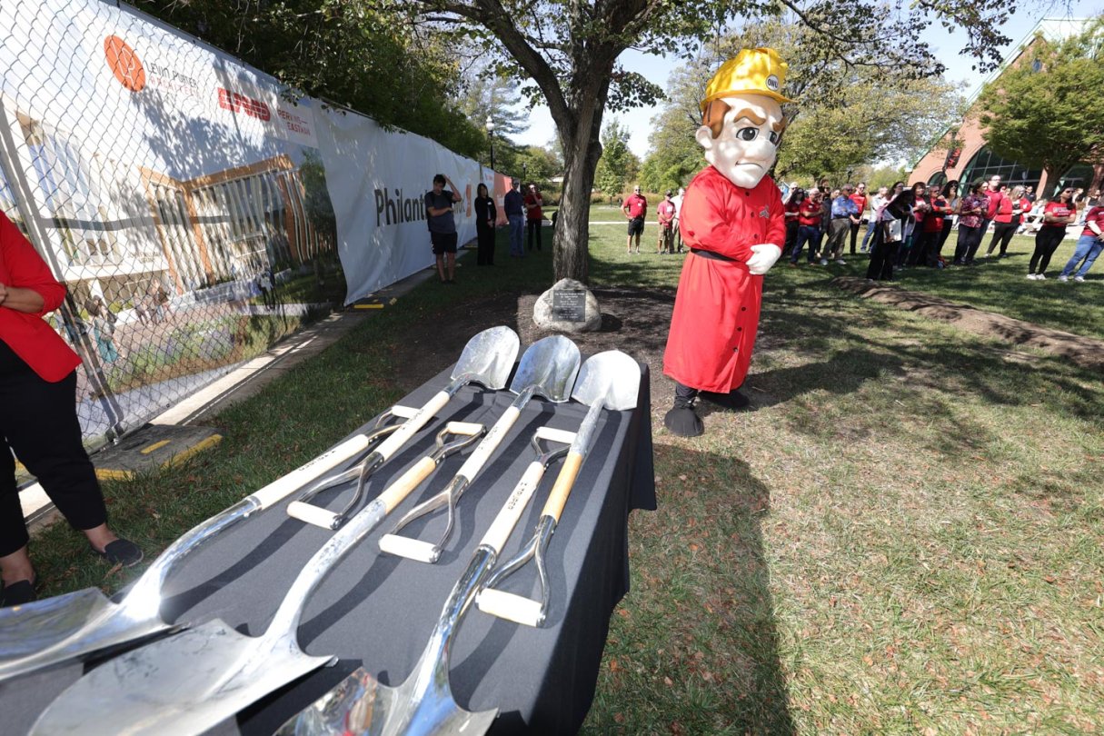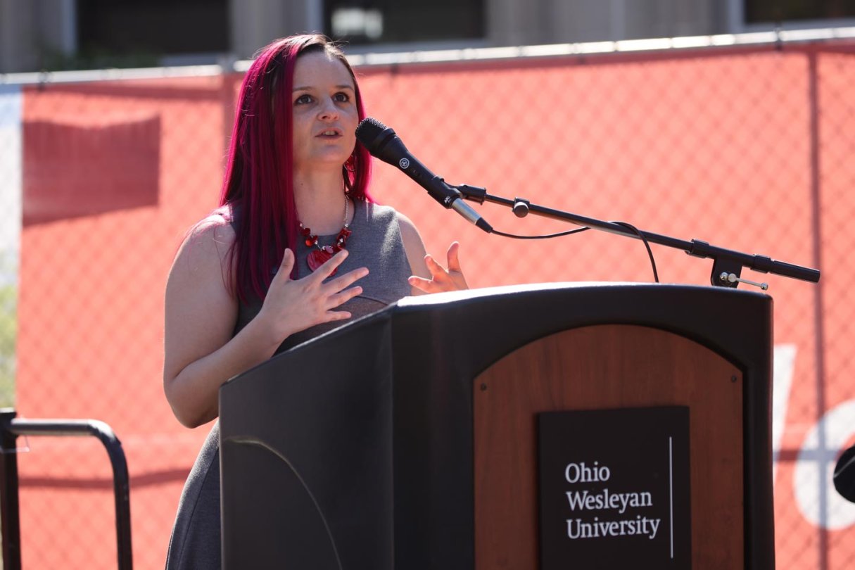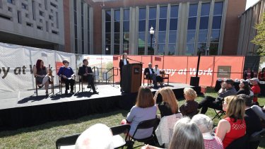 During a campuswide celebration Oct. 3, Ohio Wesleyan President Matt vandenBerg turned a ceremonial shovel of dirt and introduced donors to share news of $15 million in gifts and commitments to create the Smith Center for Faculty Excellence and the Palmer Center for First-Generation Student Success.