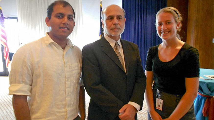Pictured here are Adi Manohar ’12; Ben Bernanke, Chair of the Board of Governors; and Shannon Delaney ’12. (Photo courtesy of Shannon Delaney ’12))