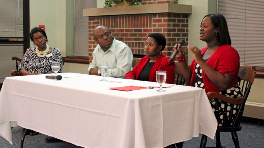 Guest panelists shared their academic and professional experiences during the recent Alliance for Black Student Leadership dinner, hosted by OWU. (Photo by Mike Serbanoiu ’15)