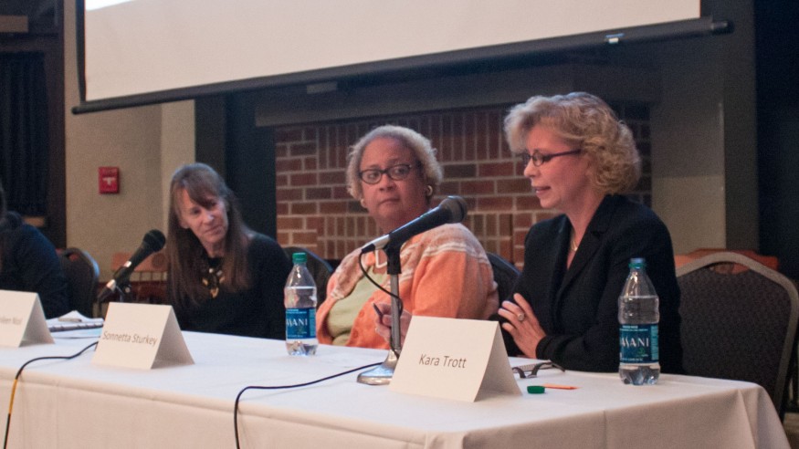 Three Ohio Wesleyan alumnae discuss their careers during the university’s first “Leading the Way: Women in Business” panel discussion. Participating on the panel are Colleen K. Nissl ’72 (left), Sonnetta Sturkey ’83, and Kara Trott ’83. (Photo by Caleb Dorfman ’15)