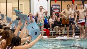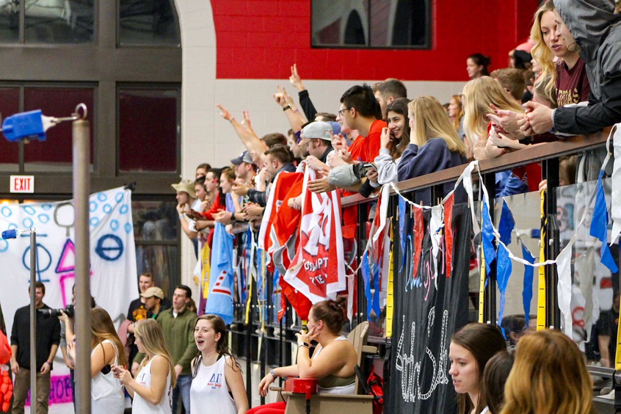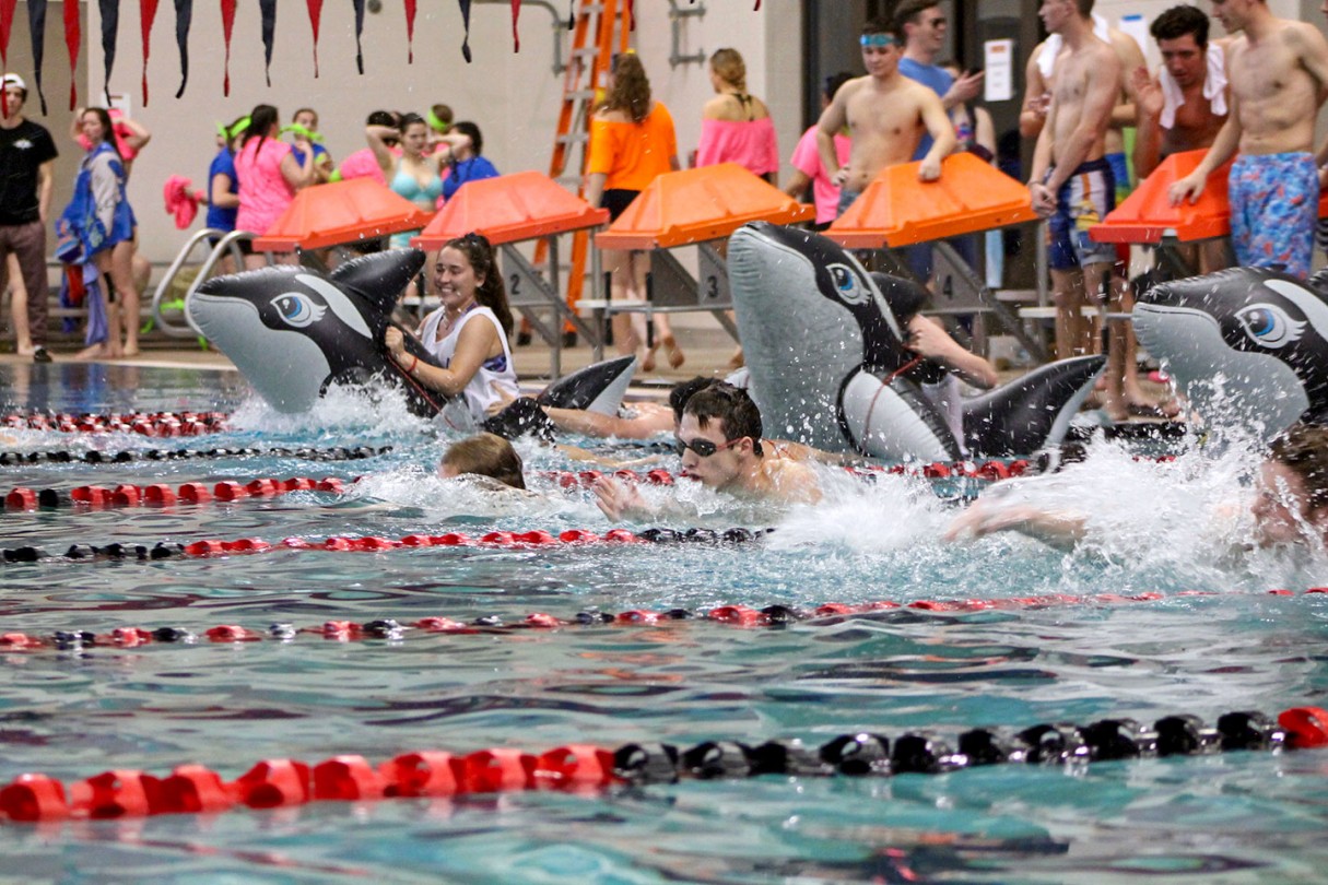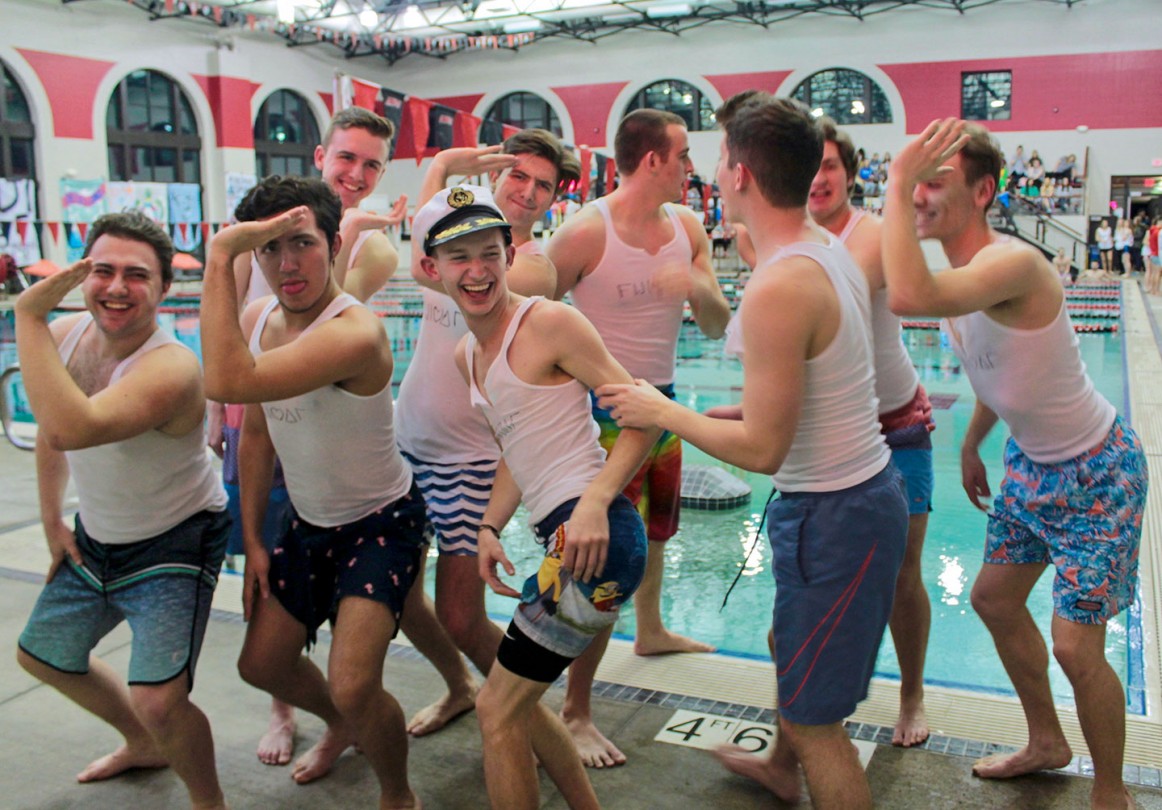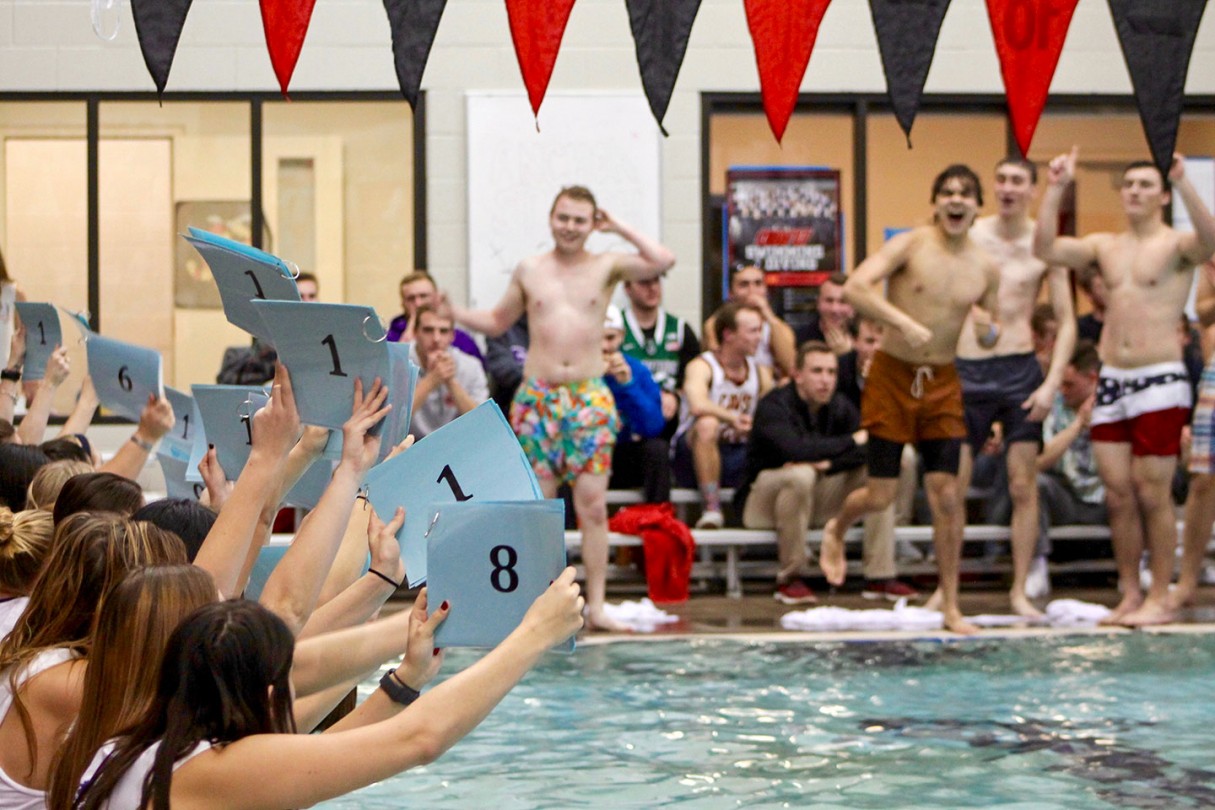 The FIJI fraternity entertains the crowd at the sisters of Delta Gamma’s annual Anchor Splash. The philanthropic event supports Service for Sight, which aids people with visual impairments. The evening includes swimming and synchronized dancing events at the Meek Aquatics and Recreation Center. (Photo by Hannah Wargo ’19)