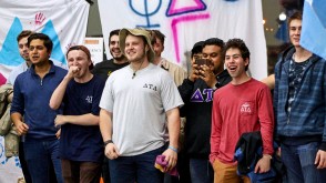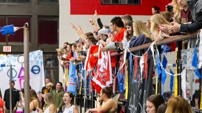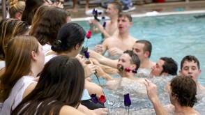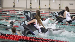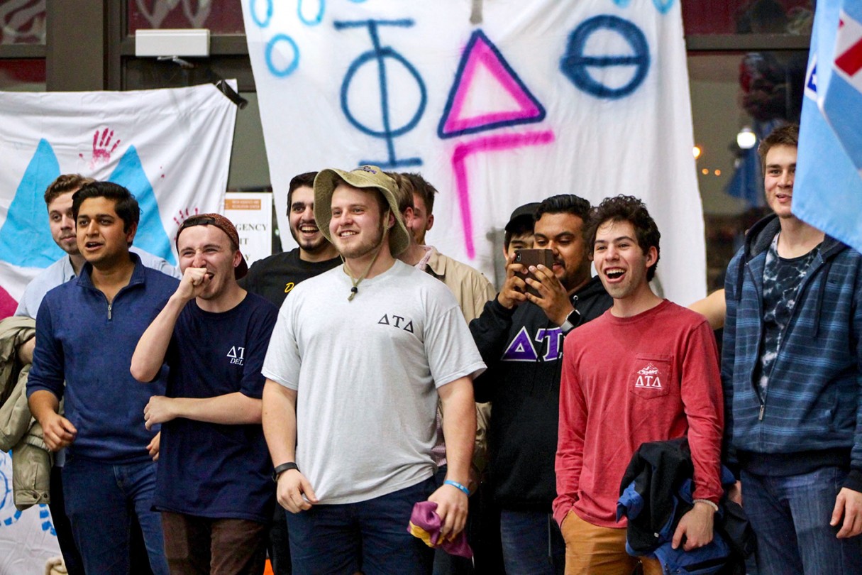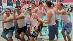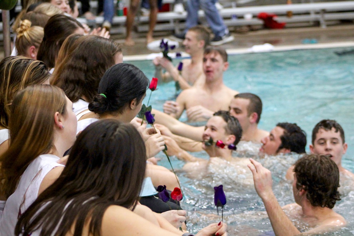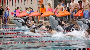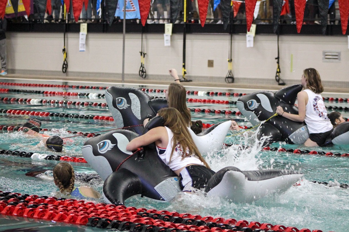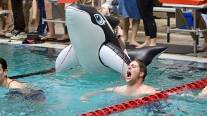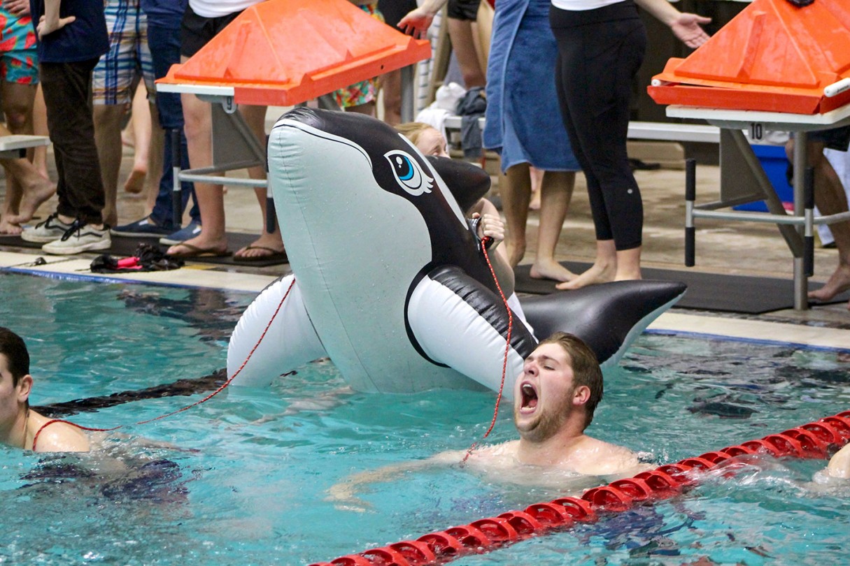 The FIJI fraternity entertains the crowd at the sisters of Delta Gamma’s annual Anchor Splash. The philanthropic event supports Service for Sight, which aids people with visual impairments. The evening includes swimming and synchronized dancing events at the Meek Aquatics and Recreation Center. (Photo by Hannah Wargo ’19)