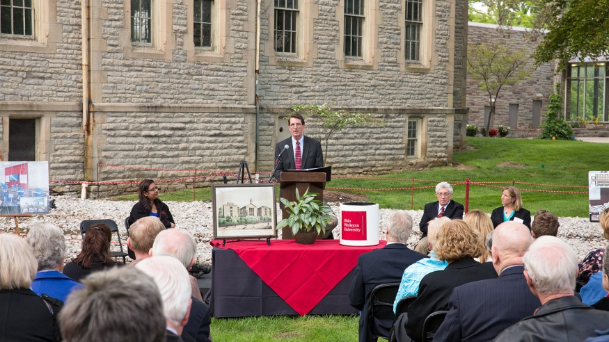 OWU President Rock Jones addresses the crowd May 16 at the Merrick Hall groundbreaking. Also speaking were Aara Ramesh ’14 (left), emeritus professor Richard Smith, and professor Amy Downing. A time capsule was created to open 100 years from now. (Photo by Lisa Digiacomo)