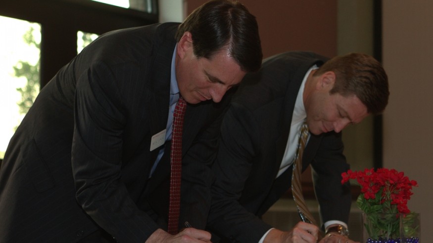 Ohio Wesleyan President Rock Jones (left) and Columbus State President David Harrison sign an articulation agreement between the two schools. (Photo by Mark Schmitter '12)