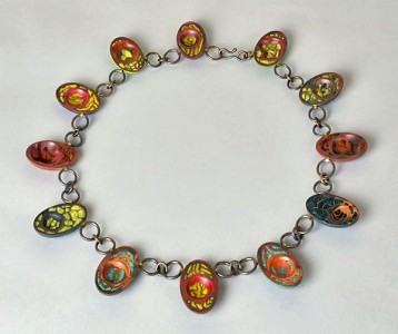 His “Blue-Green Fracking Well” sculpture was created using copper, nickel, cupric nitrate, and silver nitrate. His “Softshell Necklace” incorporates copper, brass, merino wool, liver of sulfur, Prismacolor pencil, and heat patina.
