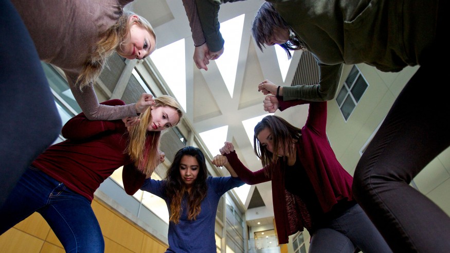 Ohio Wesleyan University will present ‘Orchesis 2014’ Nov. 15-17. The contemporary dance performance will include, clockwise from left, Lauren Holler, Maddie Presley-Wolff, Yasmin Radzi, Buzzy Biddinger, and Katie Sponseller. (Photo by Mark Schmitter ’12)