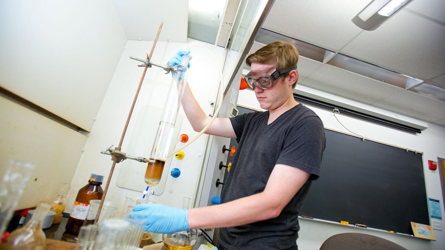 Ohio Wesleyan junior Alexander Landgraf spent 10 weeks working in the laboratory of chemistry professor Kim Lance, Ph.D., as part of OWU’s Summer Science Research Program. Landgraf collaborated with his professor on research intended to improve water-purification processes. (Photo by Mark Schmitter ’12)
