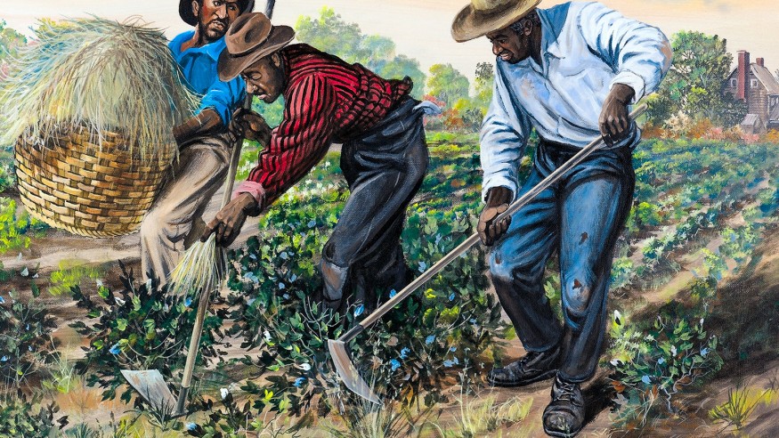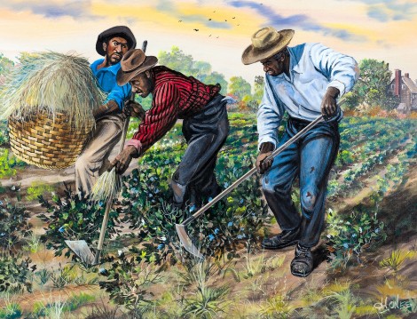 This acrylic painting by John W. Jones, titled ‘Slaves Hoeing Cotton,’ was inspired by an image engraved on Civil War-era currency. Prints of 30 paintings created by Jones for his ‘Confederate Currency: The Color of Money’ project will be on display from Jan. 14 through Feb. 25 at Ohio Wesleyan University. Jones will speak on campus Feb. 18. (Image courtesy of John W. Jones)