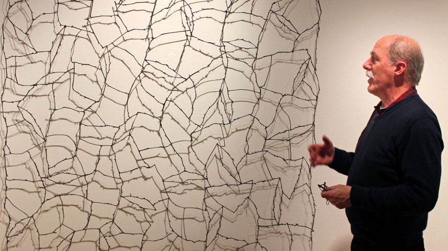 Larry Cressman discusses his artwork, including ‘Ground Cover I’ made of daylily stalks, which will be displayed Jan. 13 through Feb. 15 at Ohio Wesleyan University’s Richard M. Ross Art Museum. Cressman will speak Jan. 15 at the university. (Photo by Cole Hatcher)