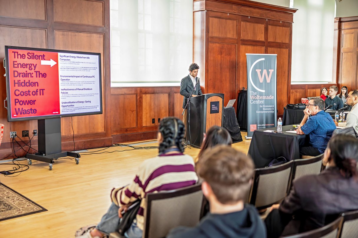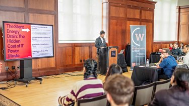 - $750 recipient: Sophomore Aarav Singh, a Data Analytics major from Lucknow, India, for IPM+. Singh's sustainability solution proposes to reduce AI data center energy consumption by 50%, cut carbon emissions, and decrease the reliance on fossil fuels. Using patented AI algorithms, IPM+ would optimize computer power use without disrupting AI workloads. Singh says IPM+ would extend hardware lifespan by 30% and reduce e-waste and resource depletion.