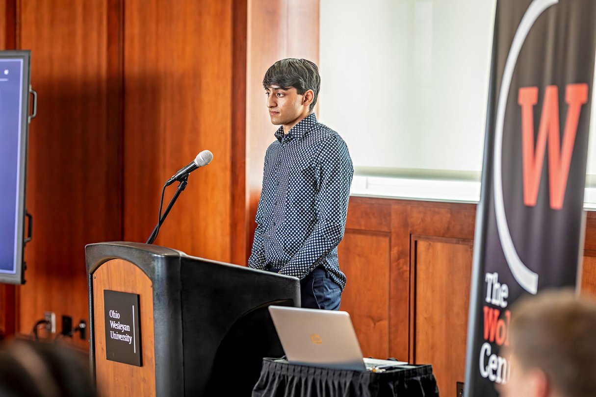 Senior Thomas Stathulis of Westerville, Ohio, earned the top prize in The Woltemade Center's Pitch OWU competition, also besting three other proposals to earn $3,000 in seed money to launch a new business.