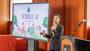 - $1,500 recipients: Juniors Aninditha Nair, a Computer Science and Data Analytics double major from Dombivli, India, and Aryaka Tickoo, a Business Administration (Management) and Environmental Science double major from Mumbai, India, for Aethera AI: Mapping the Future of Urban Cooling. They propose to use artificial intelligence, satellite imagery, and climate data to predict future urban heat zones and recommend optimal locations for green spaces to help combat the rising temperatures to support climate-resilient city planning.
