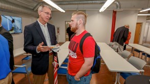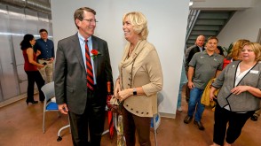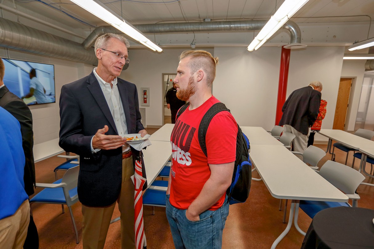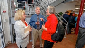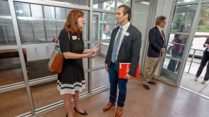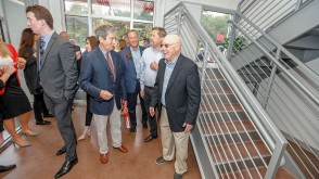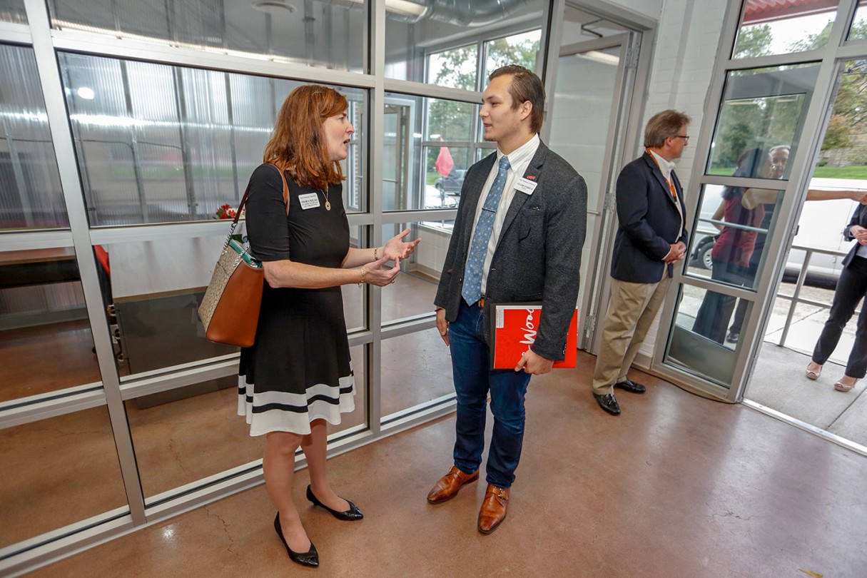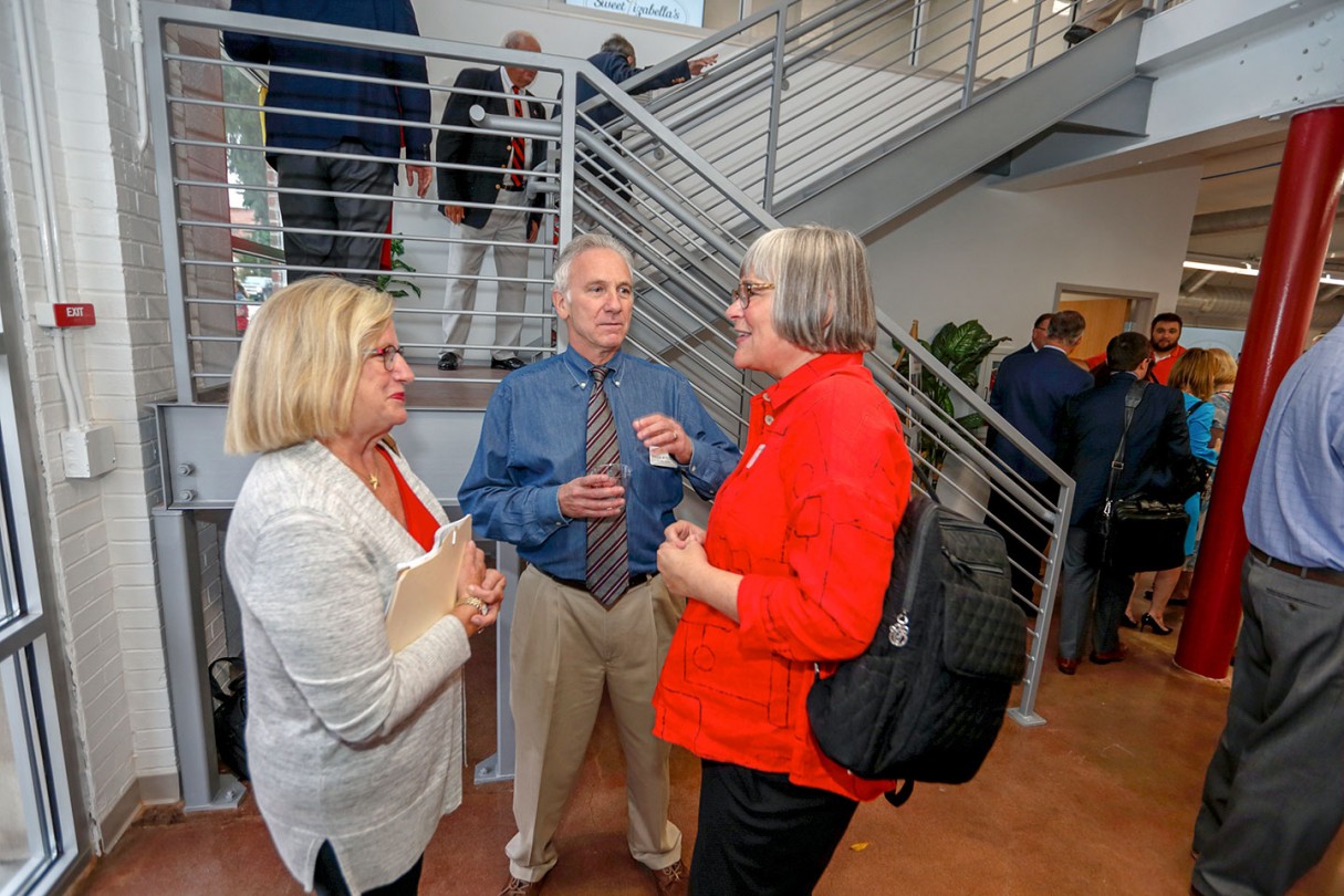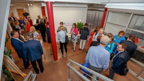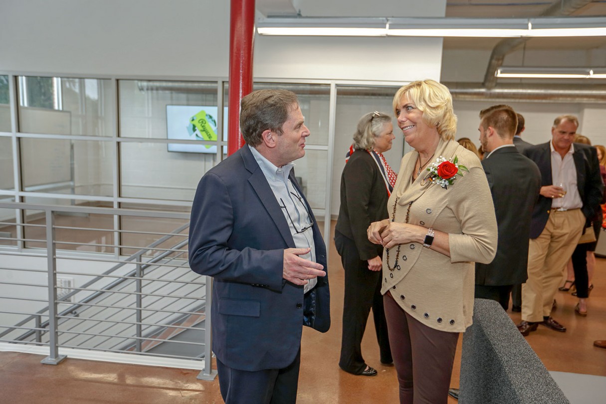 Following the ribbon-cutting, guests toured the newly renovated, two-story center, which features rentable office spaces, a shared work area, and a conference center. Those who rent space in the facility will receive assistance from Ohio Wesleyan student interns who are able to help with everything from market research, to business plans, to graphic design, and more.