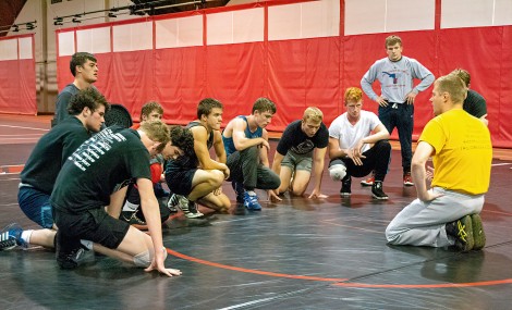 Head coach Paul Reid (far right) talks to the OWU wrestlers as the team prepares for its first match. Bishop wrestlers last took the mat in 1984. (Photo by Aleksei Pavloff ’18)