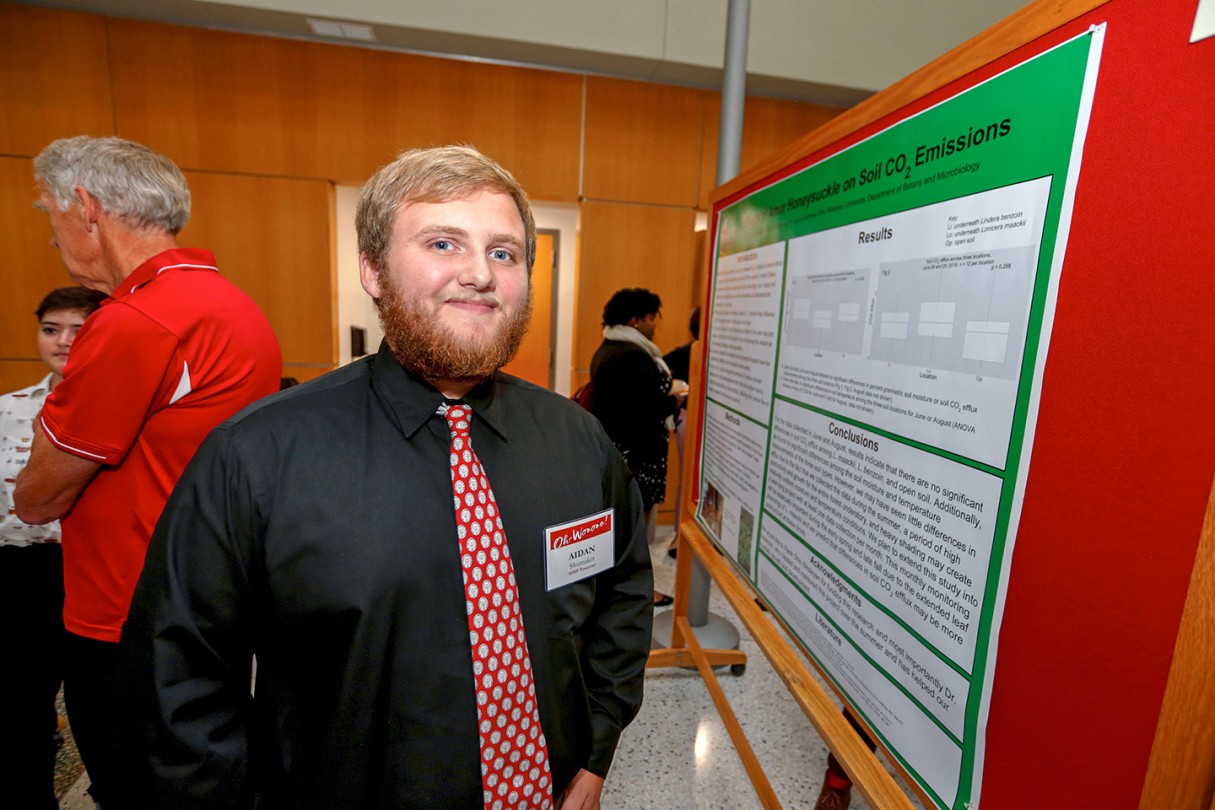 - Aidan Shumaker of Loveland, Ohio, presented “Effects of Amur Honeysuckle on Soil CO2 Emissions.” Shumaker was mentored by Laurel Anderson, OWU professor of botany and microbiology.
