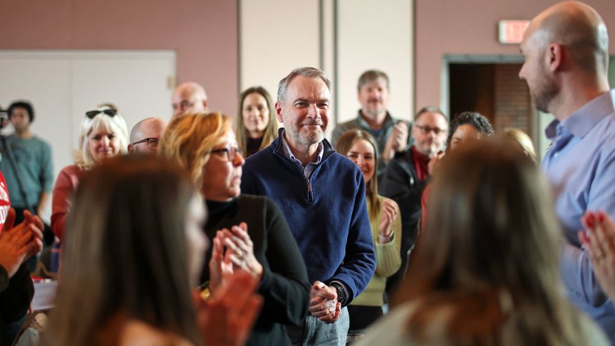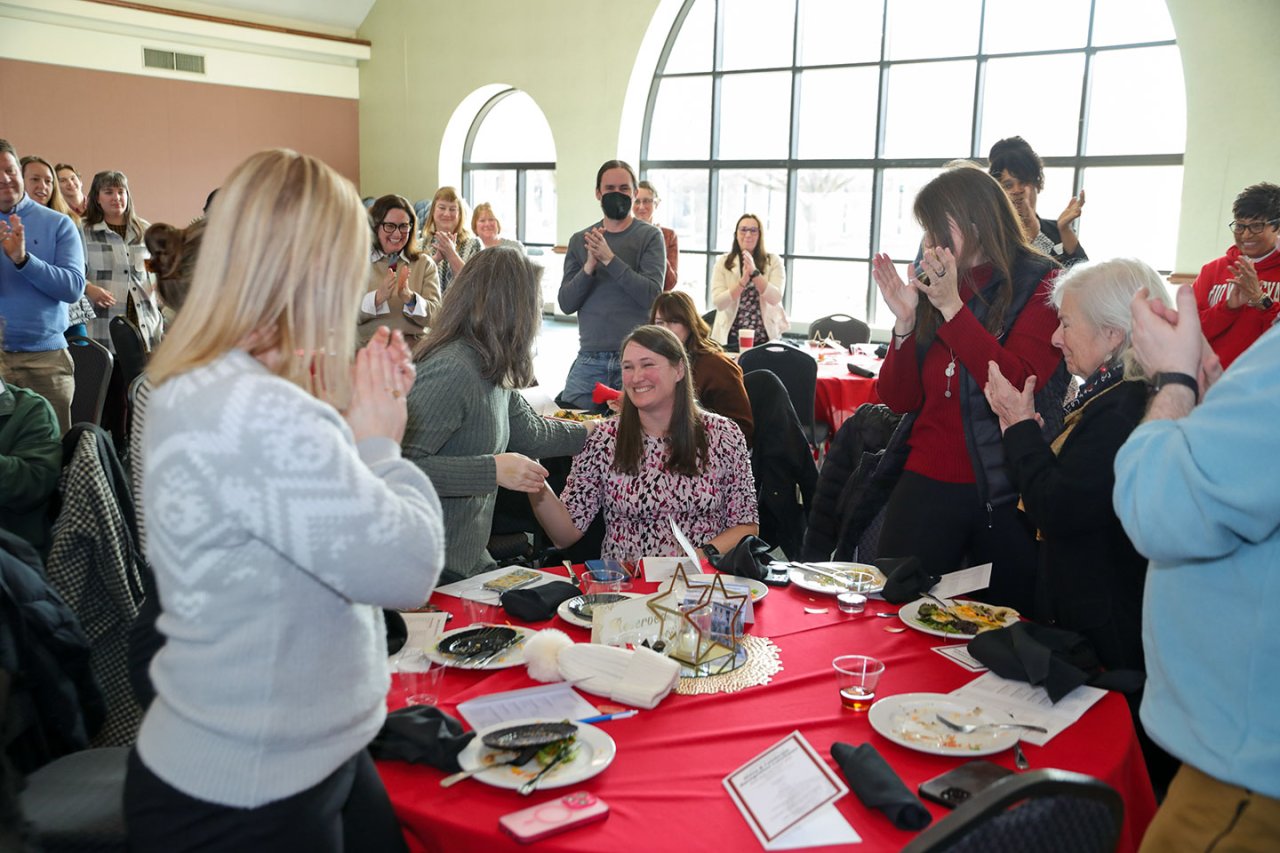 Staff memberDoug Koyle (center) receives a standing ovation from Ohio Wesleyan employees as the 2025 STAR Award winner. Koyle, OWU's associate dean of student success, was honored with the Staff Council award for his tireless efforts to support OWU students and assist campus colleagues with anything needed at any time. (Photos by Paul Vernon)