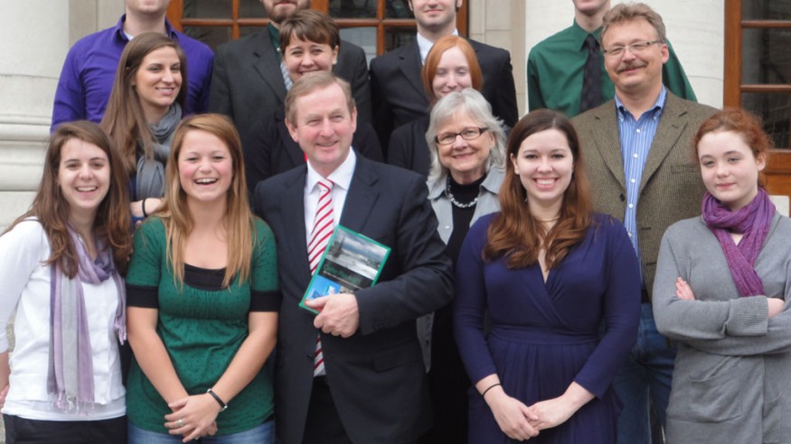 Pictured here are Irish Prime Minister Enda Kenny with the OWU travel-learning contingent that traveled to Ireland during spring break. Team members learned about the country's economy and political situation, and did some skyping with a first grade class along the way!