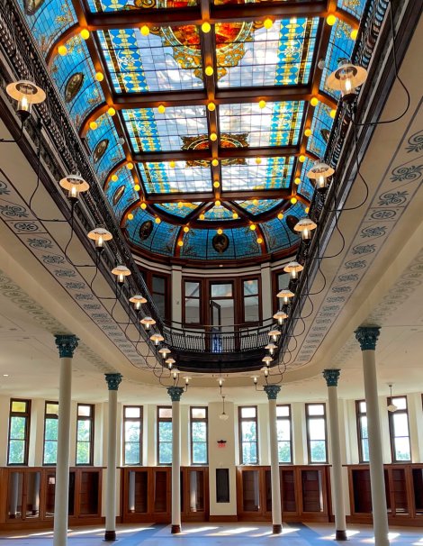 Before the restoration began, architects researched Slocum Hall and discovered it originally had a stenciled pattern on the Reading Room ceiling. They replicated the stencils by hand using enlarged historic photographs. They also recreated the painted medallions that originally aligned with the Reading Room’s columns and replicated many of its original light fixtures.