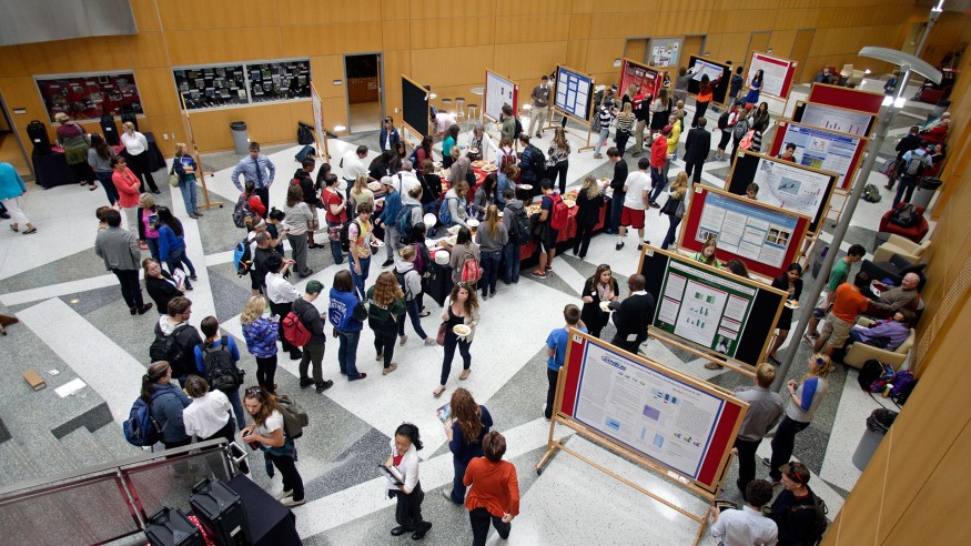 On April 15, Ohio Wesleyan will hold its first Student Symposium to showcase academic achievement. The symposium will utilize poster presentations similar to OWU’s annual Summer Science Research Symposium (shown here), but also incorporate oral presentations, music, and student-artist talks. (Photo by Paul Vernon)