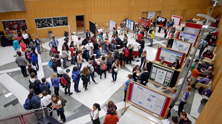 After guests walked around the atrium of Schimmel/Conrades Science Center and spoke with project presenters, President Rock Jones welcomed everyone to the symposium, including prospective students attending a “Consider Science” event.