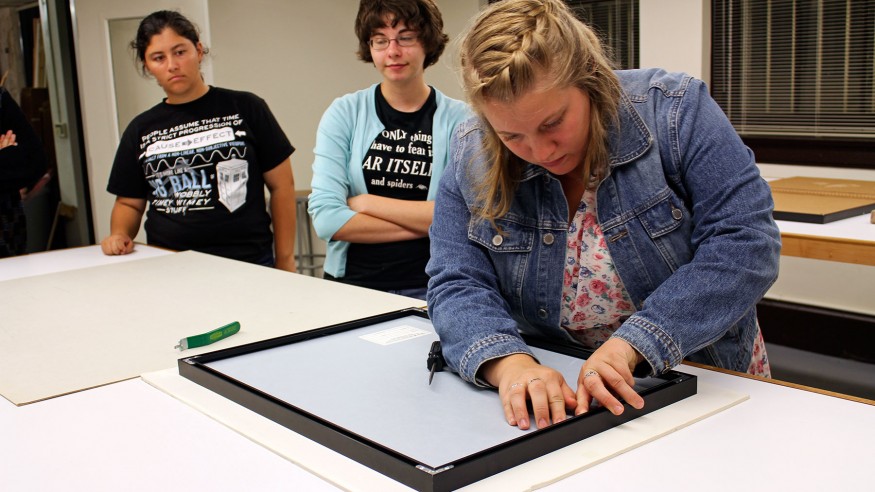OWU student Sarah Thomas works to prepare a photograph for exhibition during her gallery management class. Of the course, she says, ‘It feels more like an internship at the museum than a class, which I love.’ (Photo by Sara Jane Sheehan ’15)