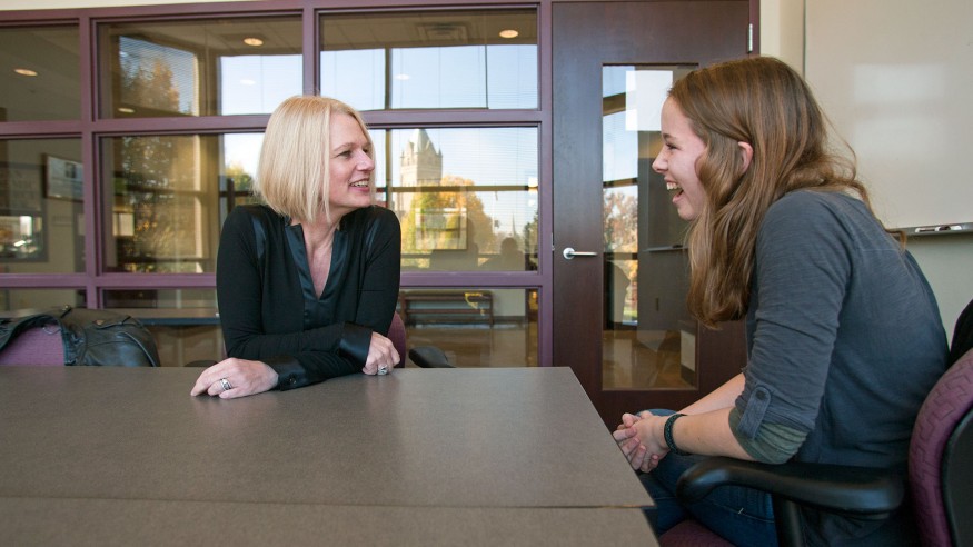 Tracie Winbigler ’87, chief operations officer for the National Geographic Society, connected with students while on campus to deliver a presentation on the evolution of digital media. (Photo by Paul Vernon)