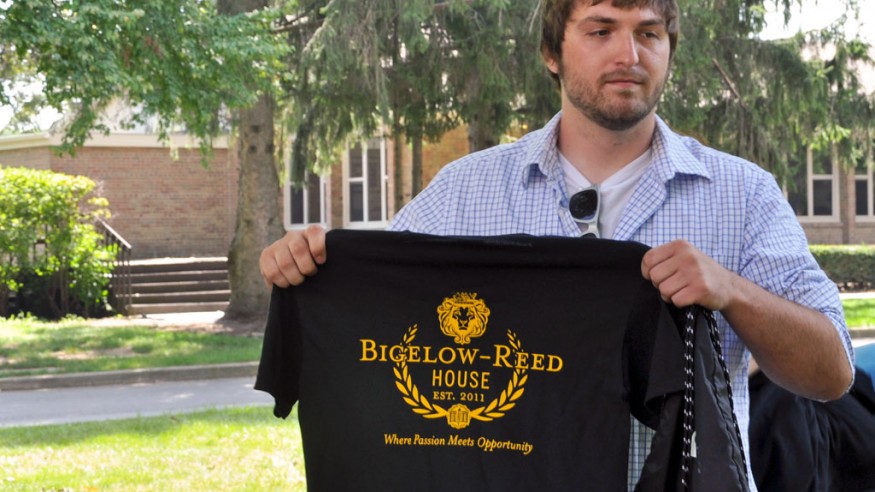 Shane Wepprich ’12 shows off the T-shirts created for the new Bigelow-Reed House at a recent open house. A dedication ceremony will be held Oct. 1. (Photo by Taylor Rivkin ’14)
